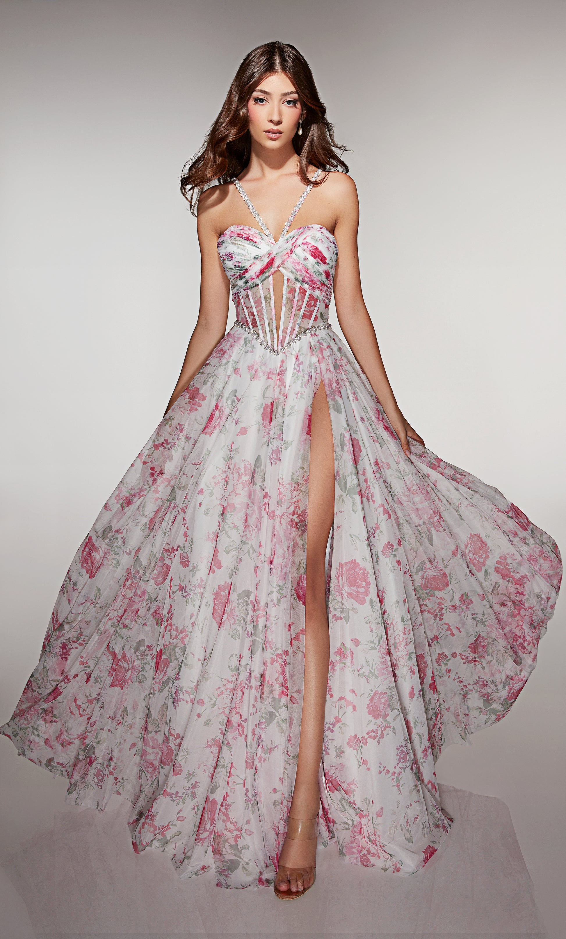 Step into the spotlight in this stunning Alyce Paris gown that's basically a red carpet dream come true! The flattering A-line silhouette glides beautifully, while the sweetheart neckline frames you perfectly. Intricate embellishments and elegant ruching add serious glamour, and the lace-up back detail gives you that show-stopping moment when you turn around. Crafted in luxe print tulle, this long gown is your ticket to looking absolutely fabulous at prom, black-tie events, or galas. Get ready to turn heads!