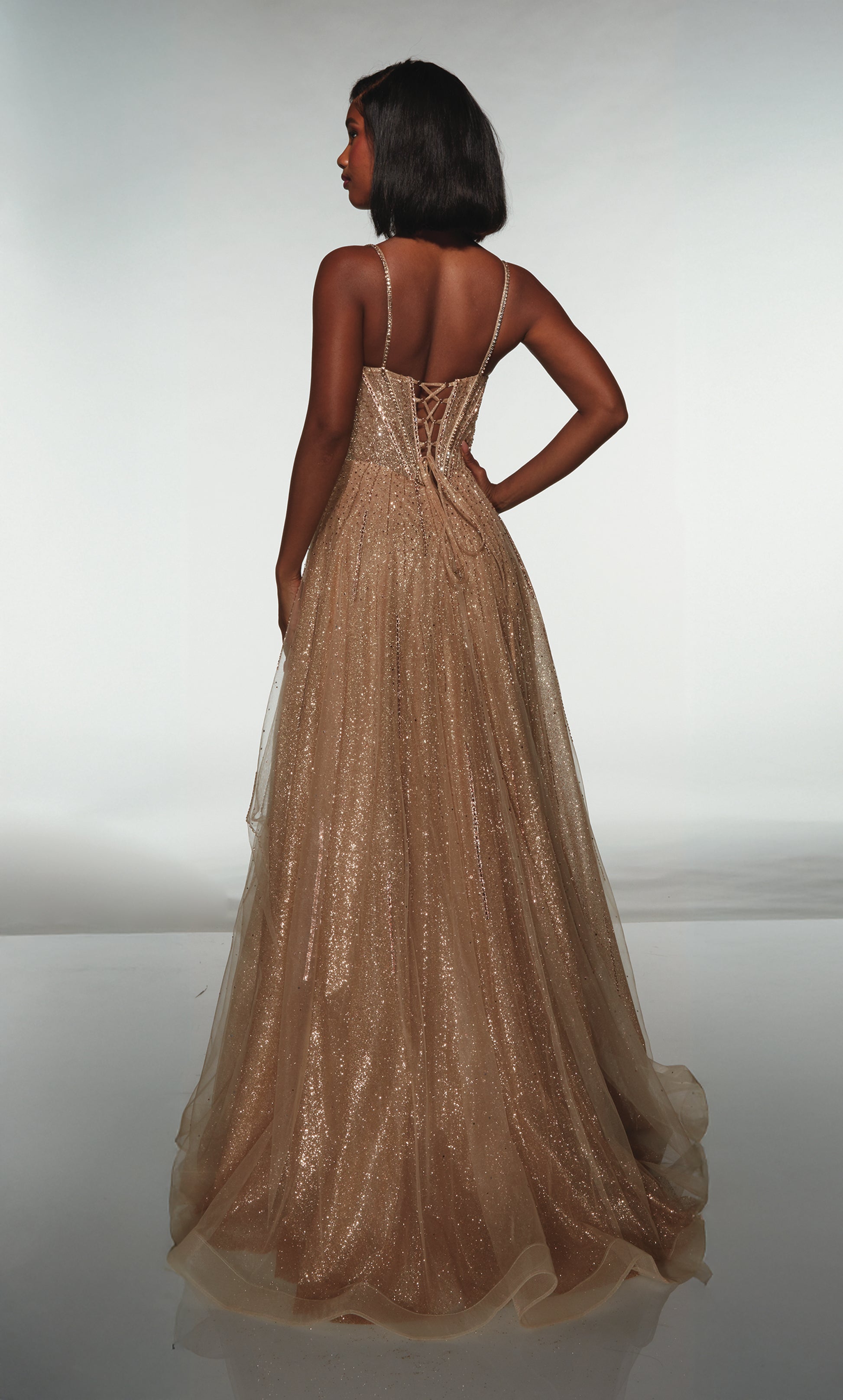 Twirl into the night in this stunning Alyce Paris gown! The A-line silhouette flatters every figure, while shimmering glitter tulle catches the light with every move. A flirty V-neckline and elegant lace-up back create the perfect balance of sophistication and sass. This long dress is absolutely packed with sparkle and embellishments, making it ideal for prom, New Year's Eve, or any evening that calls for serious glamour. Get ready to shine brighter than the ball drop!