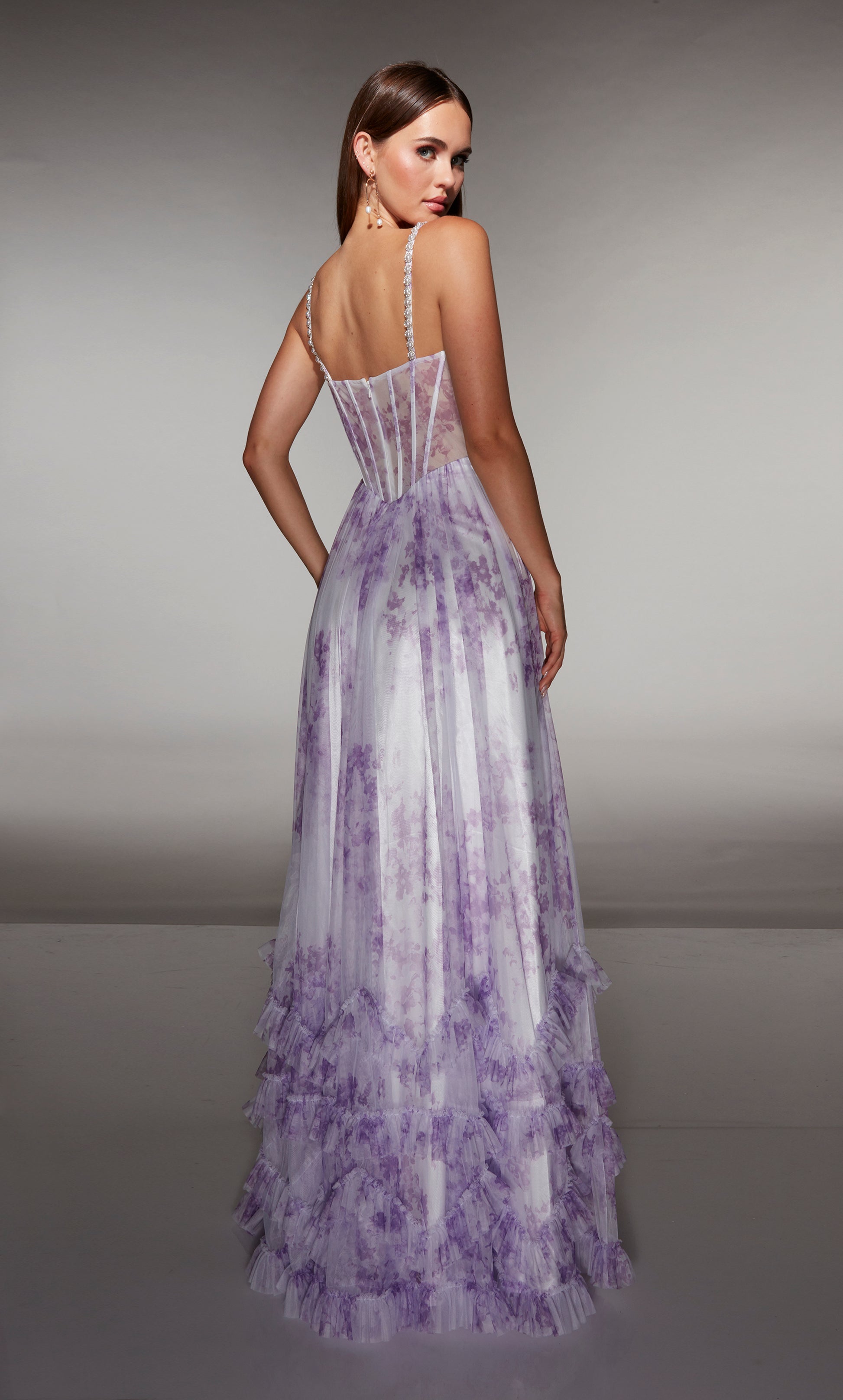Make a statement in this stunning Alyce Paris gown! The graceful A-line silhouette flows beautifully in eye-catching print tulle, while delicate ruffles and ruching add dimension and movement. The scooped neckline offers an elegant frame, and the straight-across back creates a chic, modern look. Perfect for prom, charity balls, or any unforgettable evening, this long dress combines sophistication with playful flair that'll have you turning heads all night long.