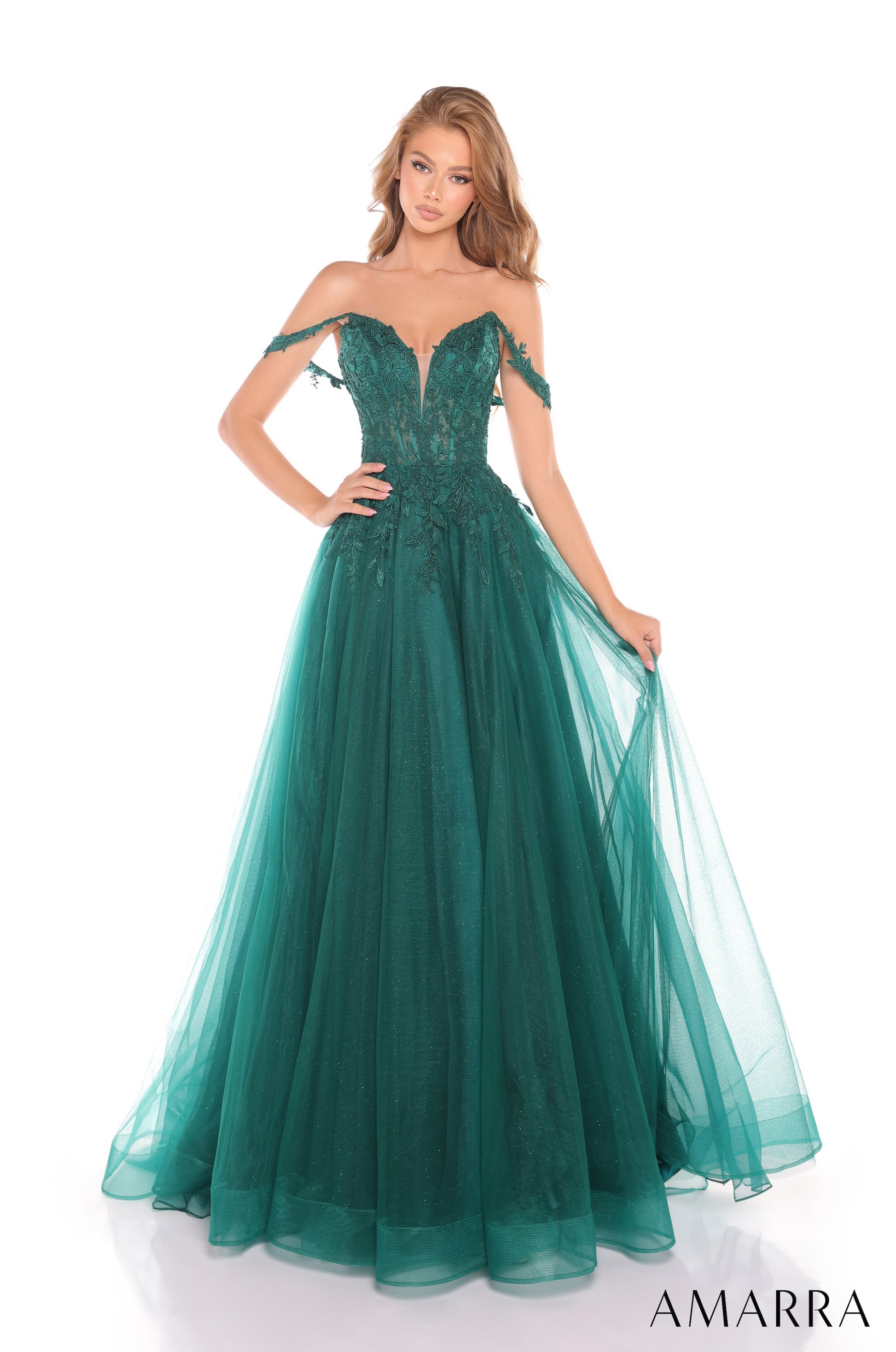 This stunning A-line gown is crafted from shimmering glitter tulle that features an intricately embroidered leaf lace pattern that adds depth and elegance to the design. The fitted corset bodice accentuates the waist, while the plunging V-neckline and off-the-shoulder sleeves create a romantic and feminine silhouette. The floor-length skirt flows gracefully from the waist, offering a flattering A-line shape that's perfect for formal occasions. Delicate floral embroidery adorns the bodice and cascades down the skirt, adding a touch of whimsy and sophistication. The gown is finished with a convenient back zipper closure, ensuring a sleek fit. This dress is ideal for those seeking a blend of timeless elegance and modern glamour for their special event.