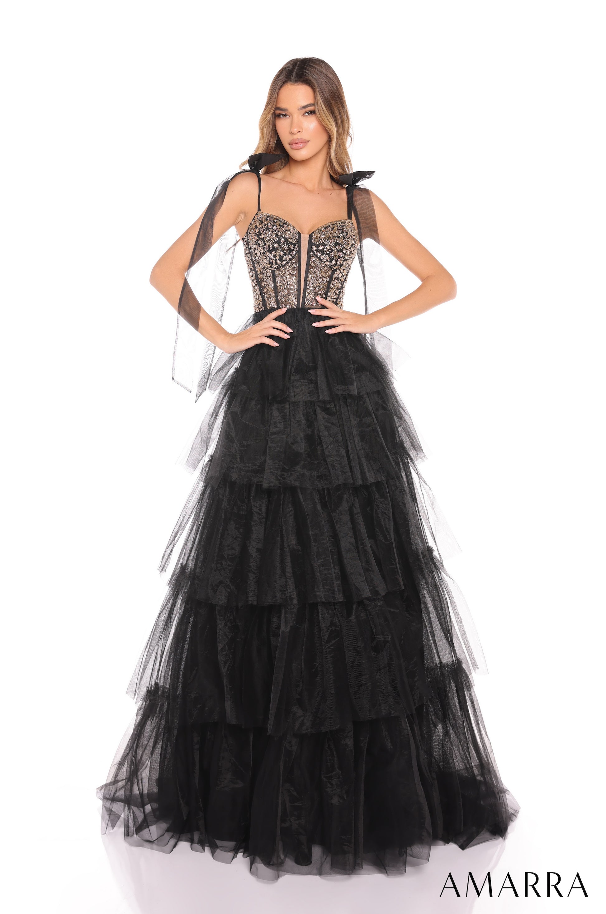 This enchanting floor-length gown is a perfect blend of romance and elegance, ideal for any formal occasion. The A-line silhouette flatters the figure, while layers of delicate tulle create a dreamy, cascading effect from waist to hem. The bodice is a masterpiece of intricate beadwork, sparkling against a sweetheart neckline that adds a touch of allure. Dainty bow straps lend a whimsical charm to the sleeveless design, perfectly balancing the gown's formal aesthetic. The dress features multiple tiers of ruffled tulle, each layer adding depth and movement to the skirt. A lace-up back, though not visible in the image, ensures a customizable fit and adds an extra element of sophistication.