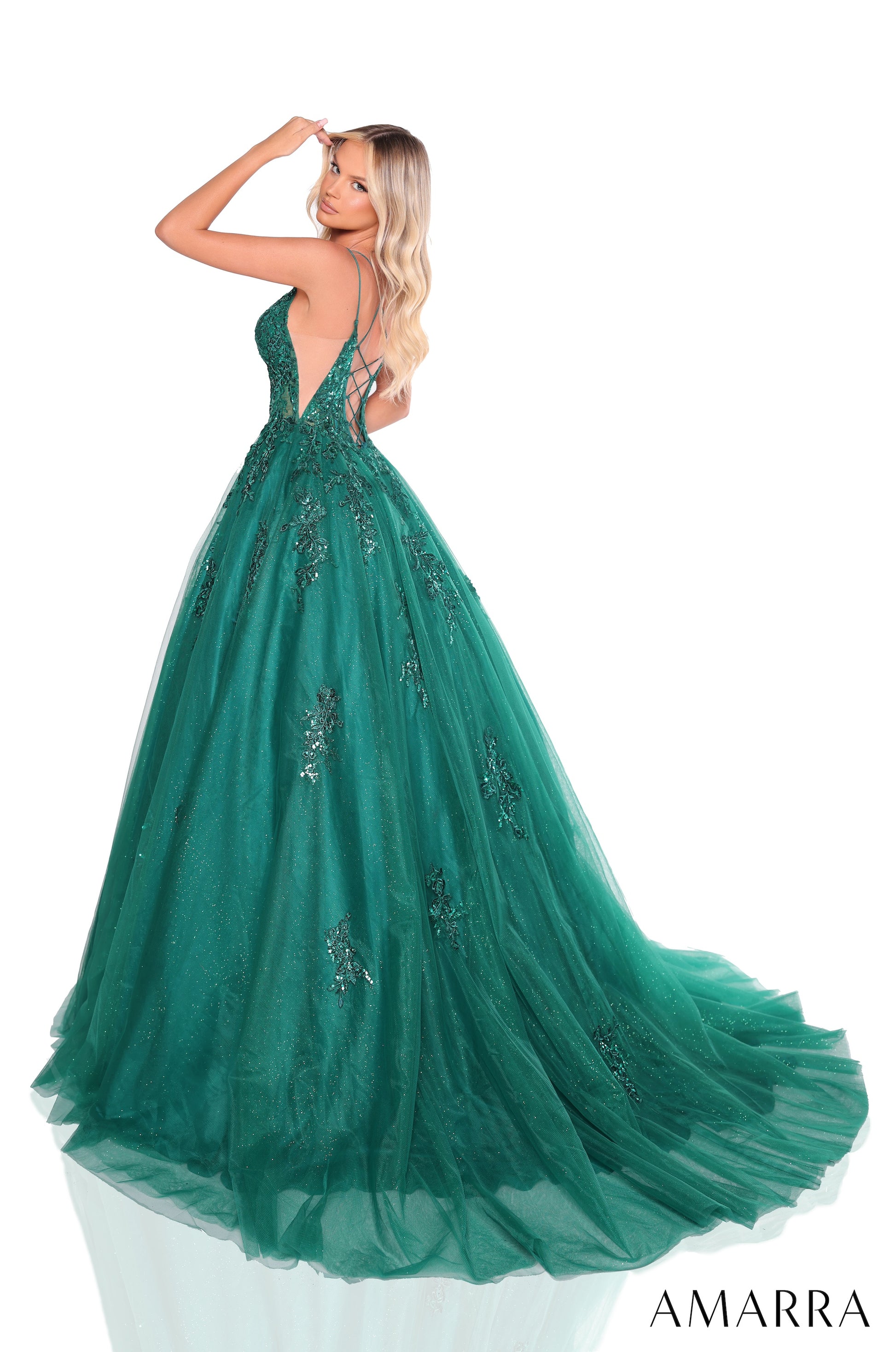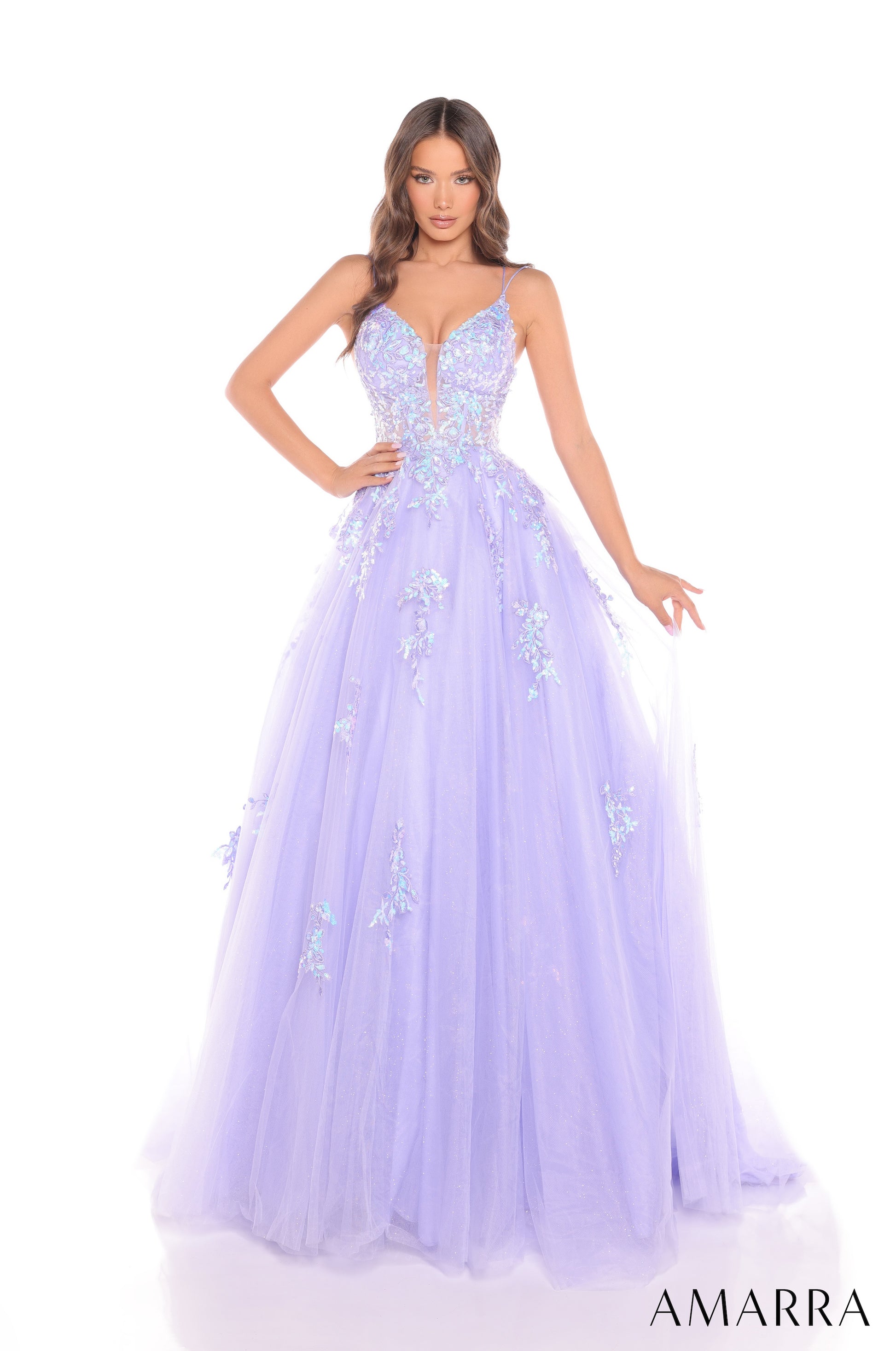 This breathtaking ball gown with a sleeveless bodice features a daring plunging V-neckline with an illusion panel for a touch of allure and support. Delicate floral embroidery adorns the bodice and cascades down the voluminous tulle skirt, complemented by sparkling sequin embellishments that catch the light with every movement. The gown's silhouette is enhanced by sheer side panels, adding a contemporary and sensual element to the classic ball gown shape. The floor-length tulle skirt flows gracefully, creating a dreamy, ethereal effect perfect for twirling on the dance floor. A lace-up back ensures a perfect fit while adding a touch of traditional charm. This stunning dress, ideal for proms, galas, or fairy-tale weddings, combines timeless elegance with modern details.