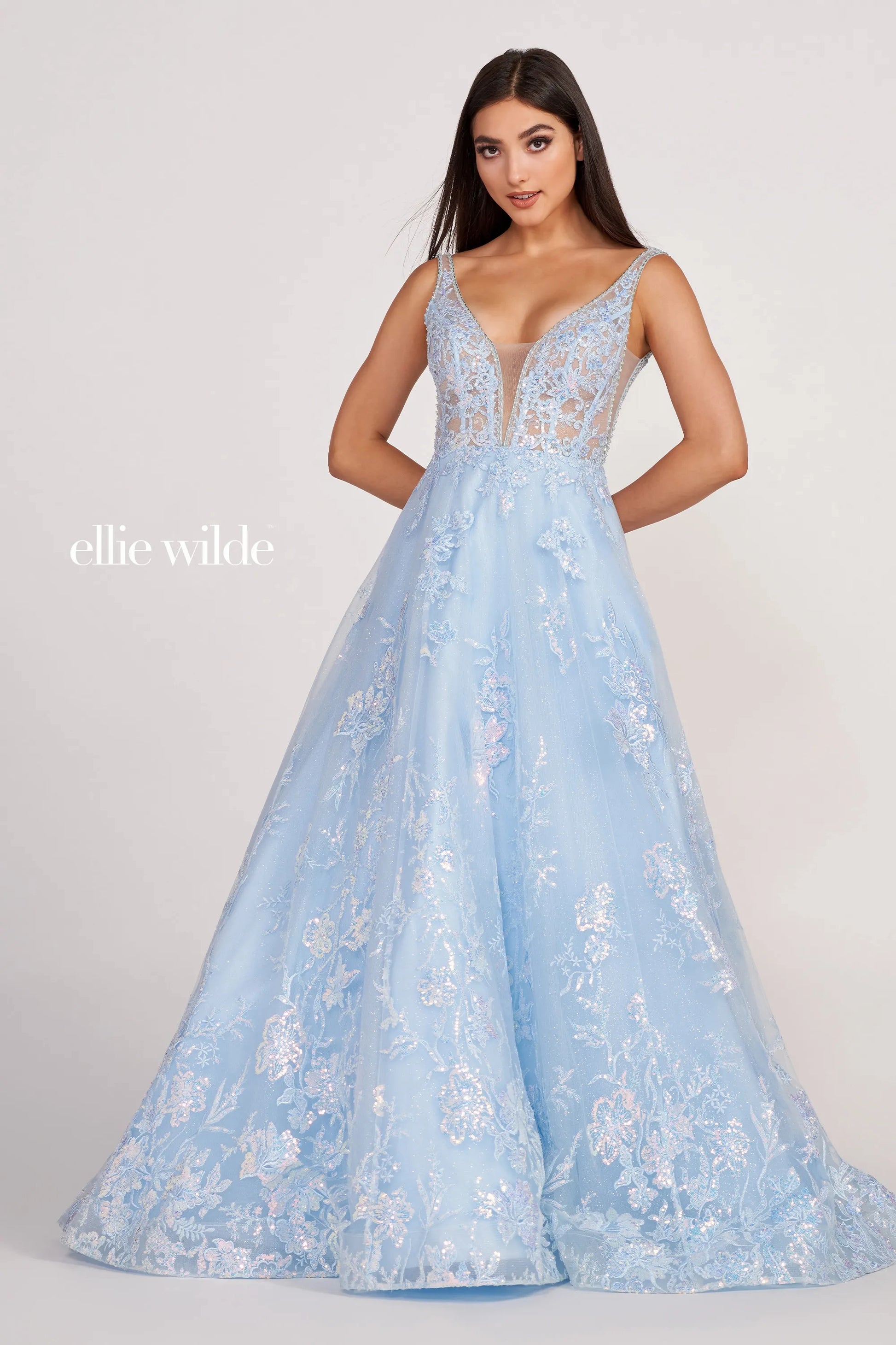Make a grand entrance in this stunning Ellie Wilde ball gown that's pure magic from every angle. Adorned with crystal beading, shimmering sequins, and glittering tulle, this sleeveless beauty features intricate embroidered lace and stone accents that catch the light beautifully. The flowing skirt hits the floor with elegance, while the natural waistline flatters your silhouette perfectly. Best part? Hidden pockets keep your essentials close without disrupting the gorgeous design. Whether you're heading to prom, a formal gala, or any special occasion, this dress delivers show-stopping sparkle and timeless sophistication.