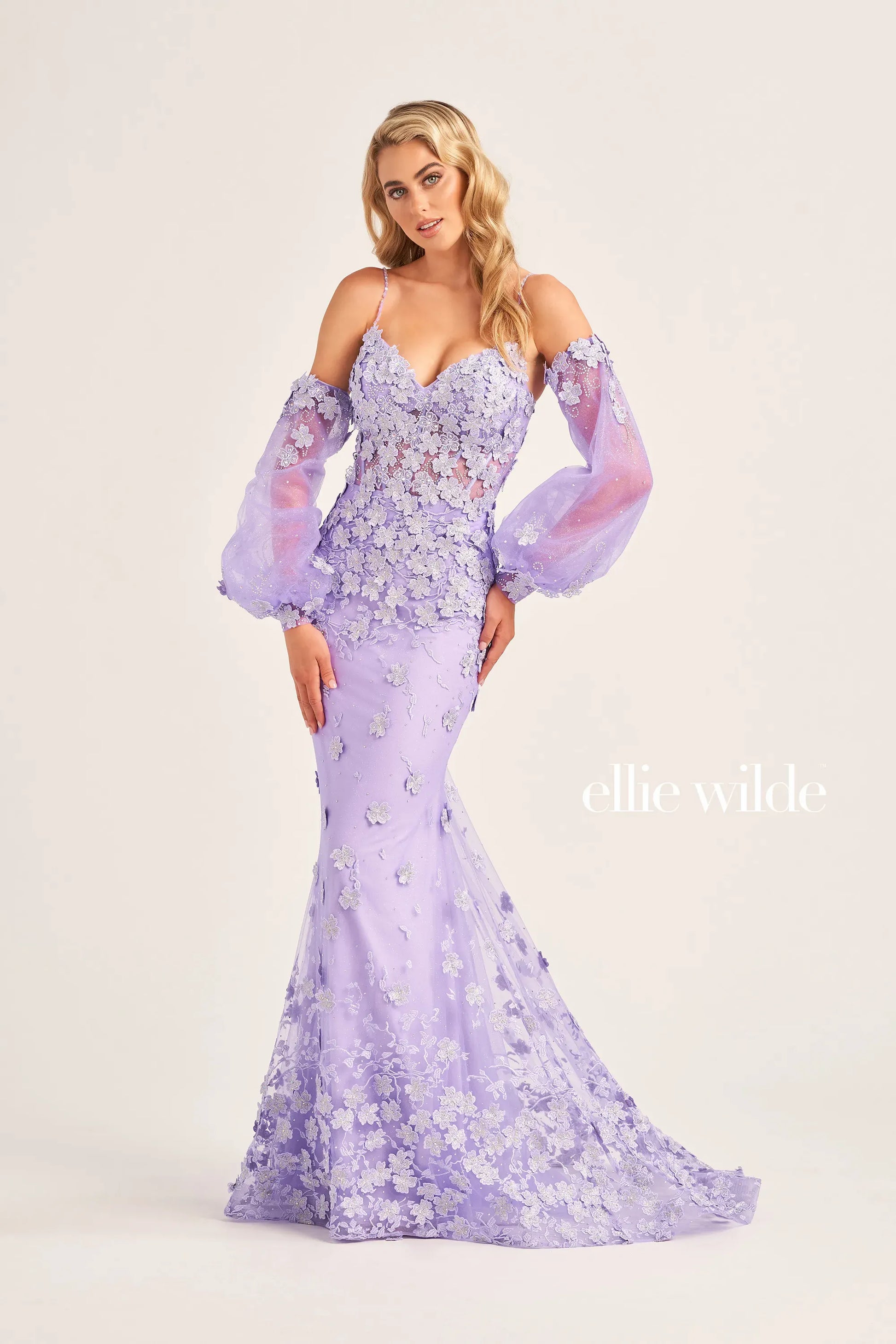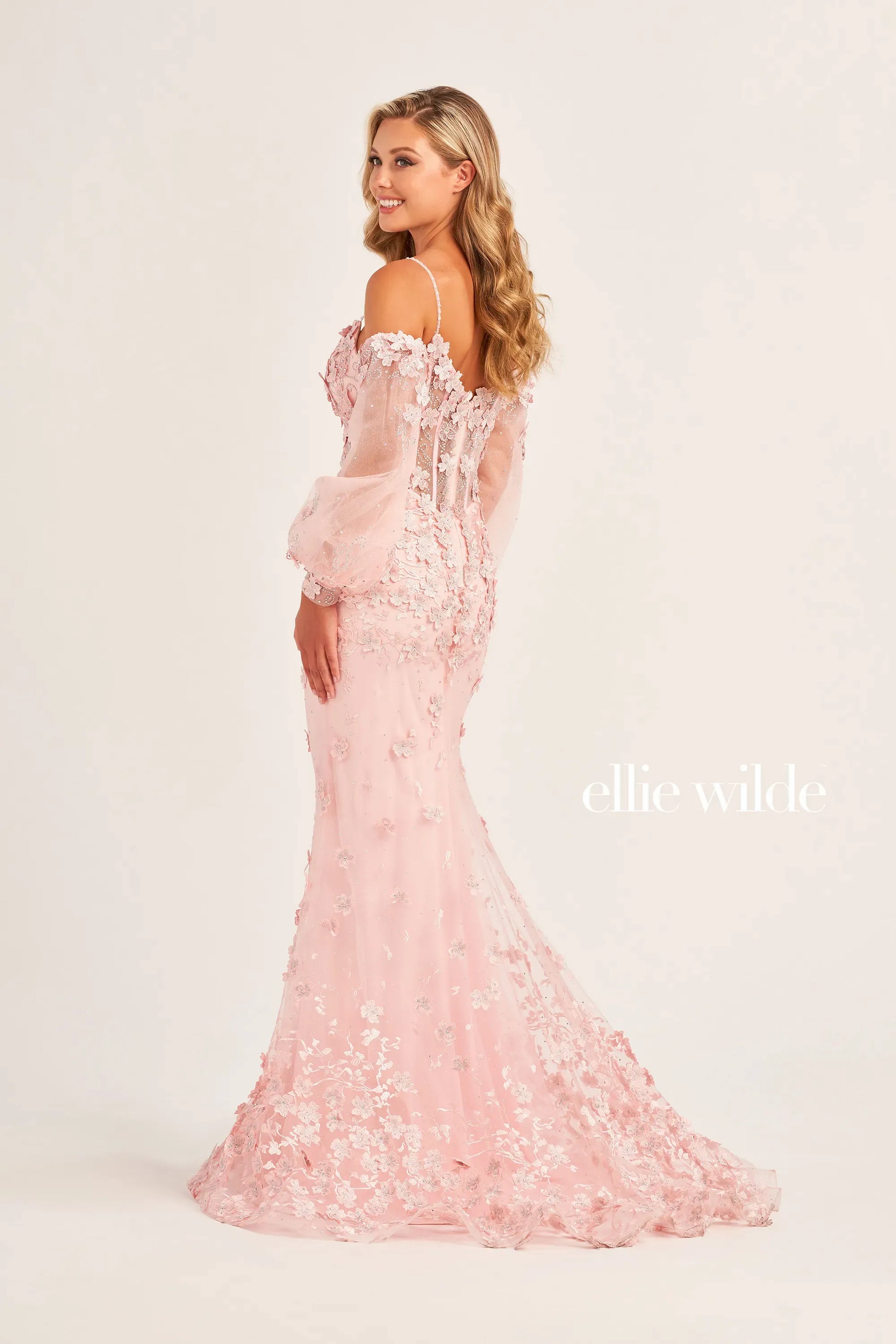 Make a grand entrance in this stunning Ellie Wilde creation! This fit-and-flare gown features shimmering glitter tulle adorned with dimensional flowers and sparkling stone accents that catch the light from every angle. The romantic sweetheart neckline and natural waistline create an elegant silhouette, while the long skirt adds timeless sophistication. Choose between sleeveless elegance or pair it with the included long sleeves for extra drama and versatility. Perfect for prom, formal events, or any night you want to feel absolutely magical!