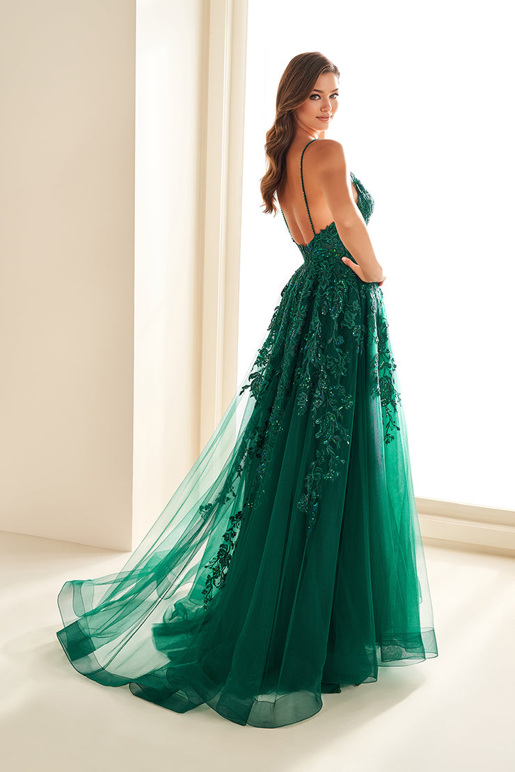 This long dress dazzles with lace appliques, organza, sequins, stone accents, and tulle. It features a sweetheart neckline and a flattering A-line shape. Sleeveless with a corset bodice, it also has pockets, a low back, and a stylish slit—all tied together with a natural waistline for an effortlessly elegant look.