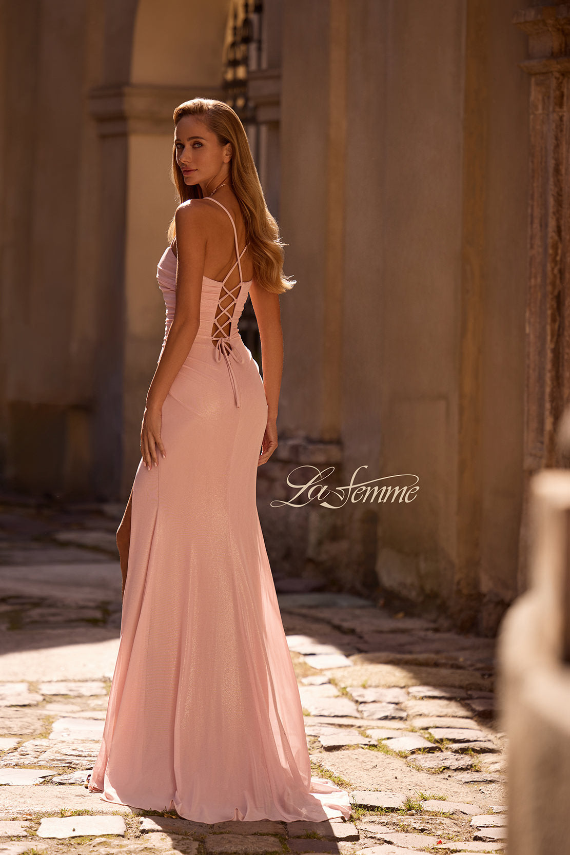 Fitted metallic net jersey ruched prom dress with a criss cross bodice design. The back features a lace up adjustable tie and hat skirt has a slit. Back zipper closure.