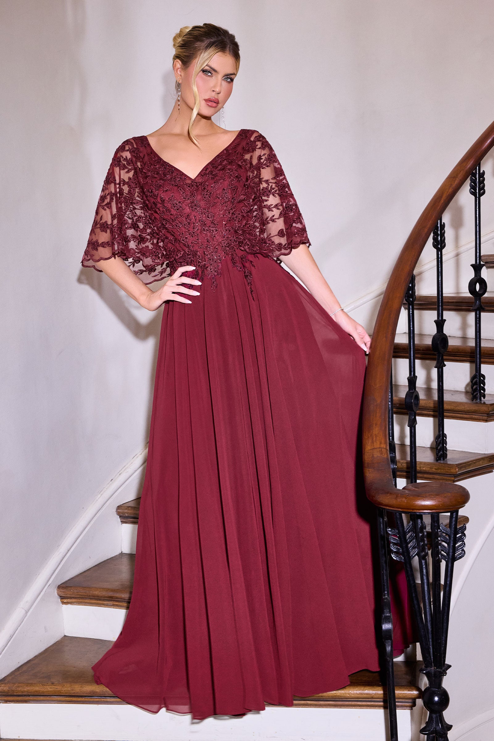A timeless and elegant choice, this flowing gown features a romantic V-neckline and a beautifully embroidered lace bodice that offers soft coverage with a refined, feminine touch. The sheer cape-style sleeves add graceful movement, while the chiffon skirt drapes effortlessly to the floor for a flattering, elongated silhouette. Finished with a secure zipper back, this gown blends ease, comfort, and sophistication—perfect for mothers of the bride, evening celebrations, or any formal affair.
