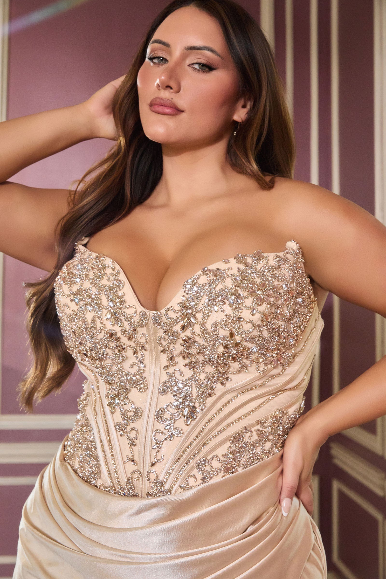 Elevate every moment in this fitted evening gown, designed with a strapless sweetheart neckline and an intricately beaded sheer corset bodice. The draped satin skirt features a high leg slit and sweep train, adding allure and graceful movement to every step. Complete with structured boning, this gown is a stunning choice for prom, galas, or any black-tie occasion.